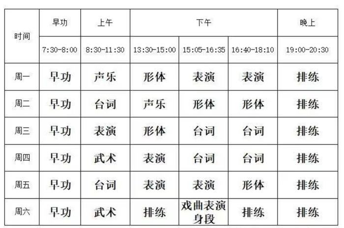 从课程设置上来看,三类培训课的内容并无差异:周一至周六,学习内容包括声乐、台词、表演、武术等。