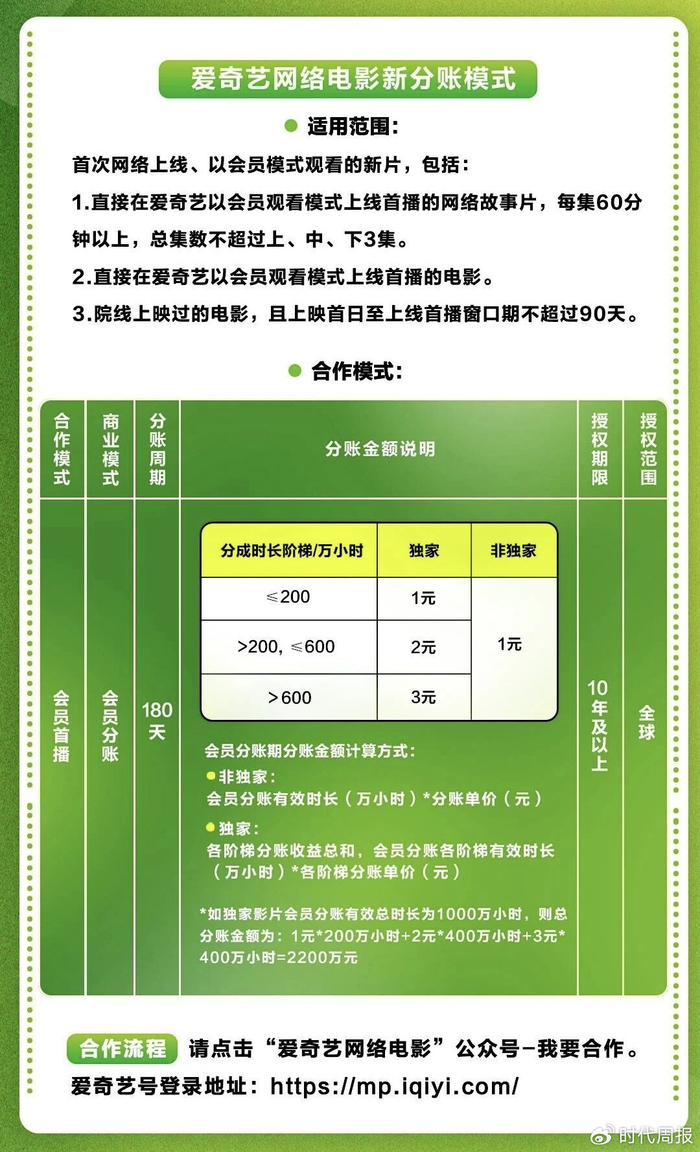 网络故事片片方可选择以独家或非独家模式合作上线爱奇艺,分账周期均为180天。独家合作下,分账金额按照三档会员观看时长阶梯获得相应分账收益:会员有效观看时长低于或等于200万小时,按照1元/小时单价分账;会员有效观看时长在200万至600万小时之间,则可以2元/小时单价获得相应分账收益;会员有效观看时长超600万小时,则分账单价涨至3元/小时。影片最终收益为各阶梯分账收益总和。非独家合作成片不区分有效播放时长阶梯,均以1元/小时单价计算分账收益。
