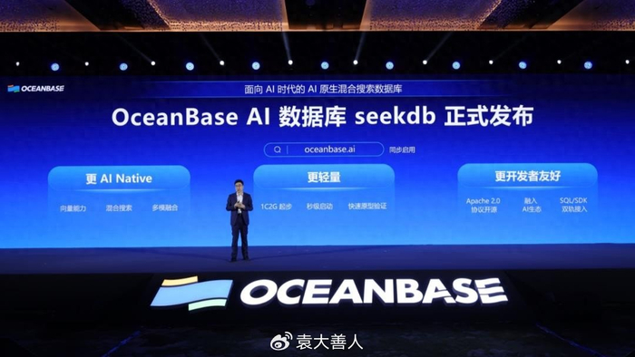 当AI从技术概念渗透为生产力核心,当全球化从“走出去”升级为“本地化深耕”,数据库作为数字世界的“地基”,正迎来一场颠覆式重构——11月18日,OceanBase在2025年度发布会上抛出“AI Native数据库”seekdb,这款开源AI原生数据库的亮相,不仅是一次产品迭代,更标志着数据库在AI时代的范式跃迁。