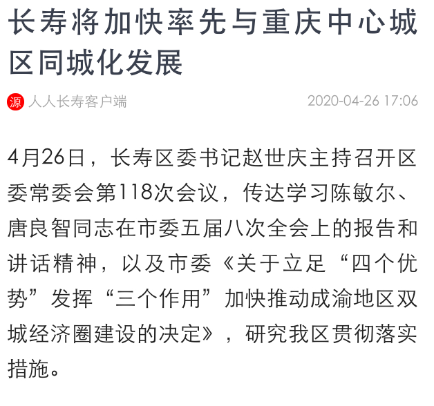 同样的,在4月底的南川区、江津区、长寿区的各个区委相关会议上,明确表态要加快与重庆中心城区同城化发展。