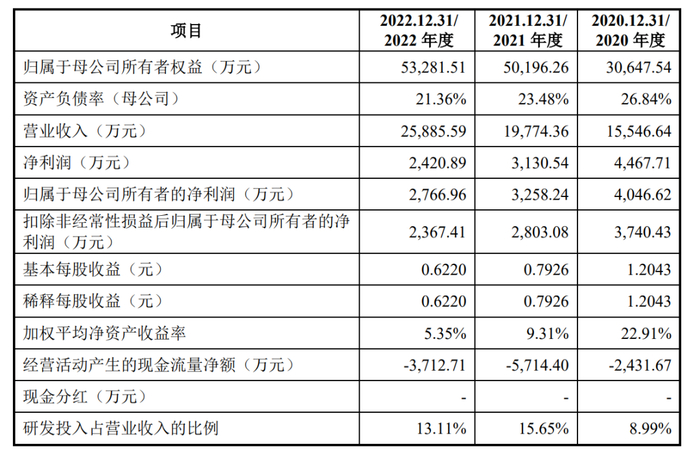 2020年-2022年公司实现营收分别为 1.55 亿元、1.98 亿元和 2.59 亿元,实现归母净利润分别为 4046.62 万元、3258.24 万元、2766.96 万元。