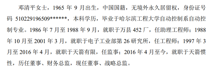 邓清平则是2001年3月才从26研究所辞职,1997年3月到2001年3月这段时间,也同时在天箭惯性做监事,两个工作时间上有重合。
