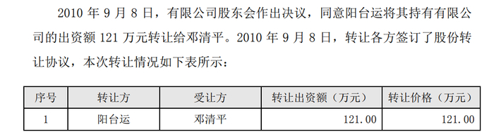 这里值得一提的是,阳台运这121万元的出资,来到2010年9月,又平价转让给了邓清平。