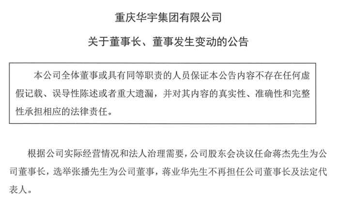 华宇集团称因为实际经营情况和法人治理需要,任命蒋杰为董事长,张播为董事。蒋业华不再担任董事长和法定代表人。