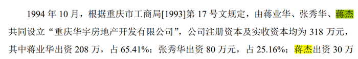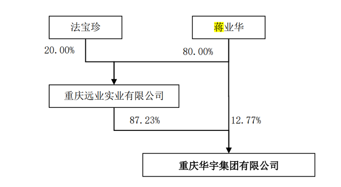 华宇集团1995年成立,注册资本10.32亿元,重庆远业实业公司持股87.23%,蒋业华持股12.77%。蒋业华也是重庆远业实业公司的实际控制人,持股80%。