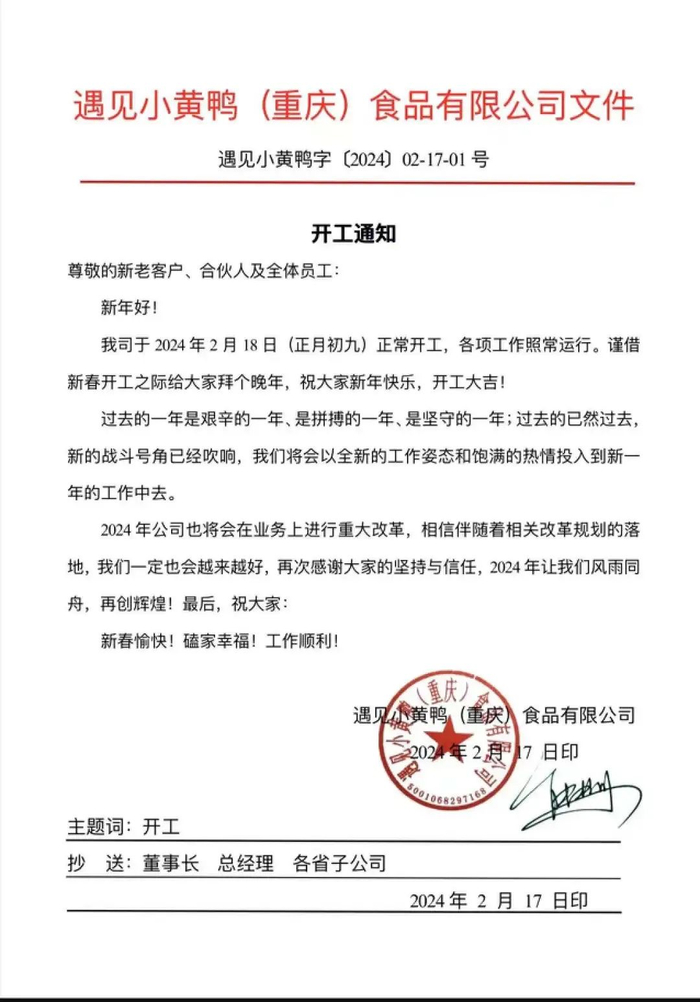 值得注意的是在2024年2月18日的时候,遇见小黄鸭还曾发布开工通知,并附上董事长熊亿川签名,抄送至全国省市子公司。