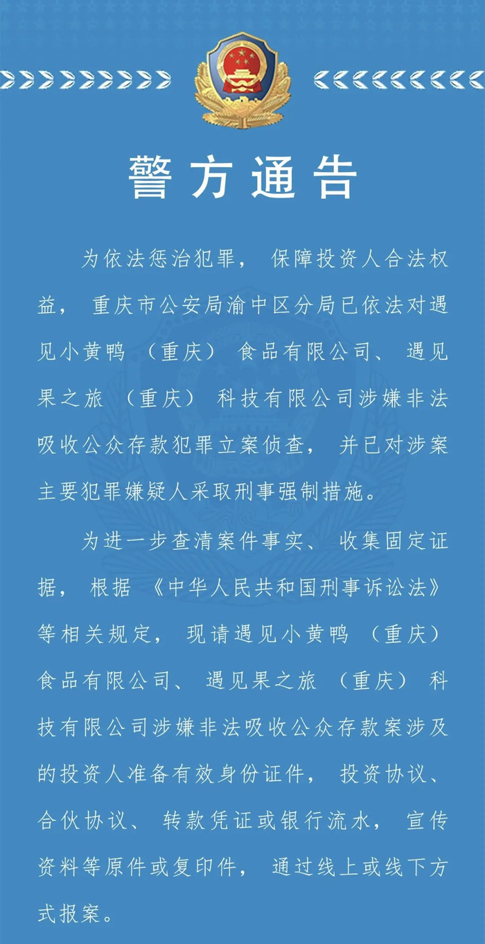 2月26日,重庆市公安局渝中区分局发布公告,遇见小黄鸭(重庆)食品有限公司、遇见果之旅(重庆)科技有限公司,涉嫌非法吸收公众存款犯罪立案侦查,并已经对涉案主要犯罪嫌疑人采取刑事强制措施。