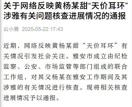 雅安市成立由纪检监察、公安、市场监管等部门组成的联合工作组,对其父杨某在雅安工作期间及其涉雅的有关情况进行核查。