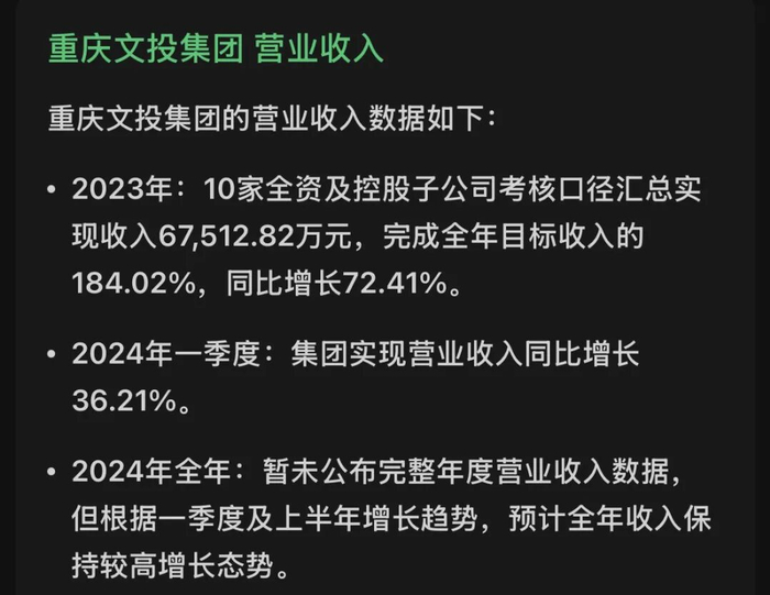 重庆文投集团官方公众号信息显示,2023年10家全资和控股子公司考核口径总收入6.75亿元,同比增长72.41%。