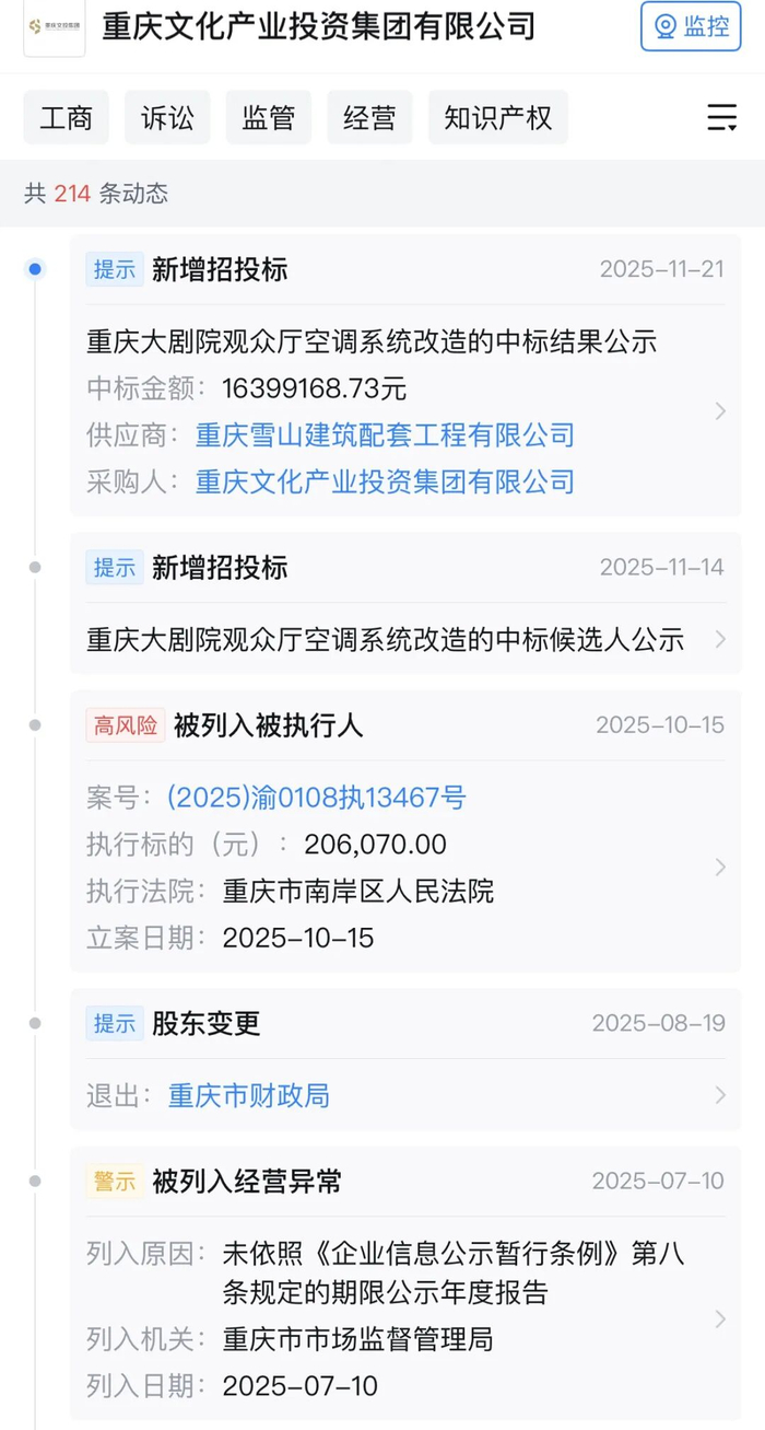 其后,在2024年11月,重庆组建了新的文化旅游集团,文投集团、重庆旅游投资集团两家并入其中。