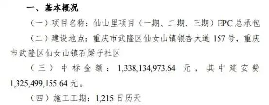 重庆建工2021年11月公告,和中冶赛迪组成联合体,共同参与仙山里项目(一期、二期、三期)EPC总承包工程的投标并中标,招标人为重庆中域财众旅游文化产业投资有限公司,中标金额为13.38亿元。