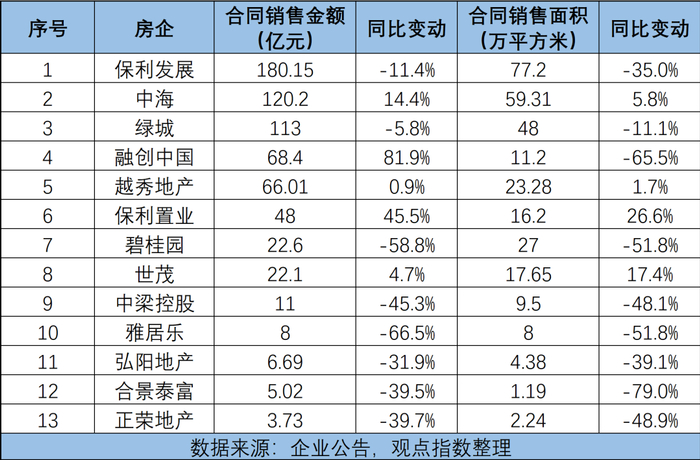 据不完全统计,目前已有13家房企公布了一月销售情况,按金额来算,表现最好的是去年的“销冠”保利,达到了180.15亿元;销售面积同样是保利暂时领先,约为77.2万平方米。不过,即便是销冠也还是出现了金额、面积双双下降的场面。