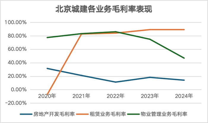 从毛利水平来看,北京城建房地产开发业务的毛利率在短短五年时间里出现了折半。其中,2020年房开业务毛利率达到31.52%,2024年这一数值仅为14.10%,五年时间减少了17.42个百分点。