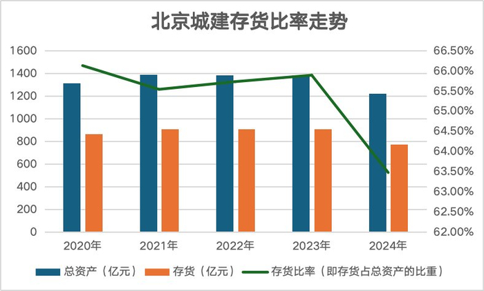 据了解,2024年,北京城建总资产共计1222.29亿元,其中存货为775.95亿元,存货比率达到63.48%,虽较前些年有所降低,但仍处于较高水平。如果计算存货与流动资产的占比,这一数值达到75.29%。