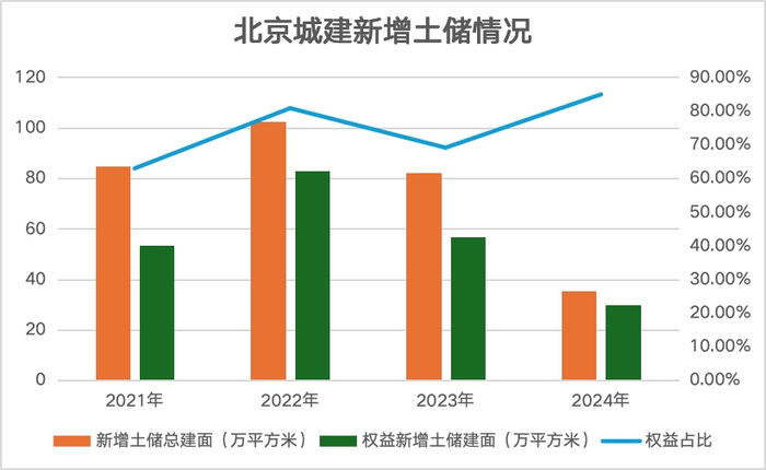 2023年,该公司新增土储建面共计82.2万平方米,同比减少19.93%;2024年新增土储进一步减少至35.2万平方米,下降五成,期内权益新增土储仅29.97万平方米。