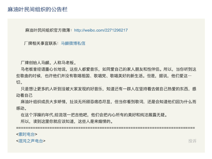 2011年4月,马頔在豆瓣建了个民间组织小站“麻油叶”,用将自己名字拆开的谐音梗,募集了数位同好,其中有后来很多为大众所熟知的民谣歌手——宋冬野、尧十三、陈粒、衣湿、花粥,他们都是这个俱乐部的成员。
