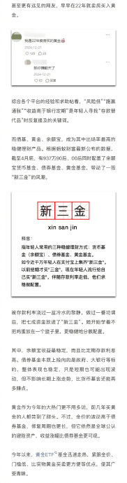 近日,国有大行一年期定存集体跌破1%,#存款利率下调钱要不要分散放#?有人选择继续存钱求个安心,也有部分年轻人选择分散放,给自己攒起了“新三金”,分别是货币基金、债券基金和黄金基金。货币基金收益稳定,比定期存款利息稍高。债券基金本质投向政府、大银行等标的,短期可能有波动,不影响长期上涨走势。黄金基金虽然是热门避险资产,但短期波动很大,更适合能承担一定风险又想增加额外收益的投资者。业内人士也提醒,求稳配置能分散风险,长期增厚收益,但投资者仍需根据自身风险偏好和目标来理性决策。“新三金”你攒了几个?