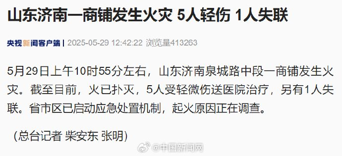 【#山东济南一商铺发生火灾1人失联# 5人轻伤】#山东济南一广场发生爆炸# 5月29日上午10时55分左右,山东济南泉城路中段一商铺发生火灾。截至目前,火已扑灭,5人受轻微伤送医院治疗,另有1人失联。省市区已启动应急处置机制,起火原因正在调查。 (央视新闻)