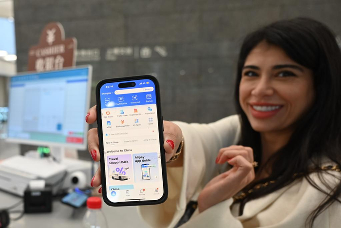 5月28日,在上海博物馆东馆文创商店,一名外国游客展示她的支付宝App。新华社记者 陈爱平 摄年逾六旬的比利时骑行爱好者克劳德·布鲁尔今年在新疆、甘肃、陕西、上海等地骑行。