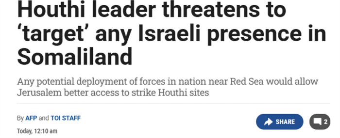 近期,随着以色列承认索马里兰,以色列有可能未来在索马里兰建立自己的据点。索马里兰与也门隔海相望,对于以色列试图在红海地区“插一脚”的做法,也门胡塞武装已经发出警告,未来任何在索马里兰的以色列目标都会成为它的攻击目标。