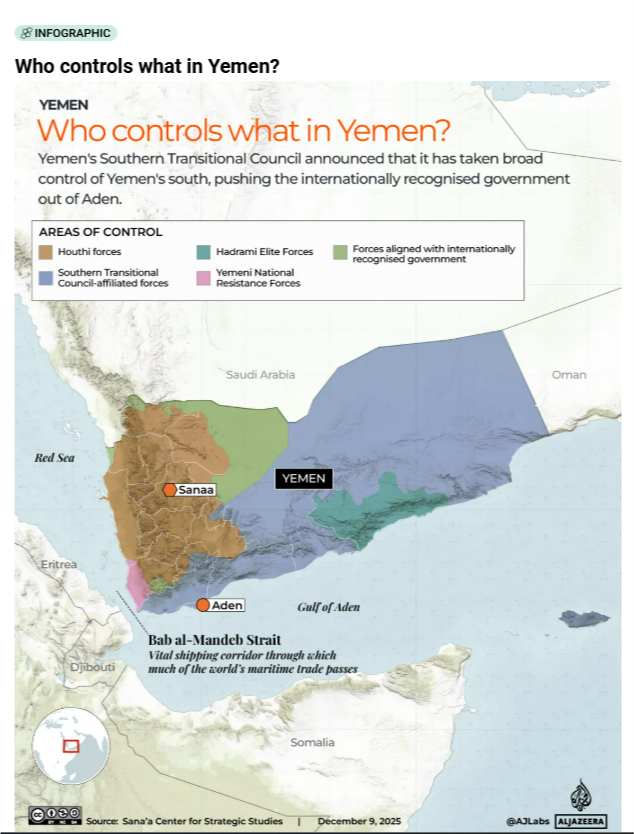 近期,南方过渡委员会在也门东部的哈德拉毛省和马哈拉省攻占了大概一半以上的领土。现在也门政府和沙特要求南方过渡委员会把新占领的领土交还,但南方过渡委员会予以拒绝。这是近期沙特对也门南部发动多次空中打击的原因,但截至目前问题并没有得到解决。