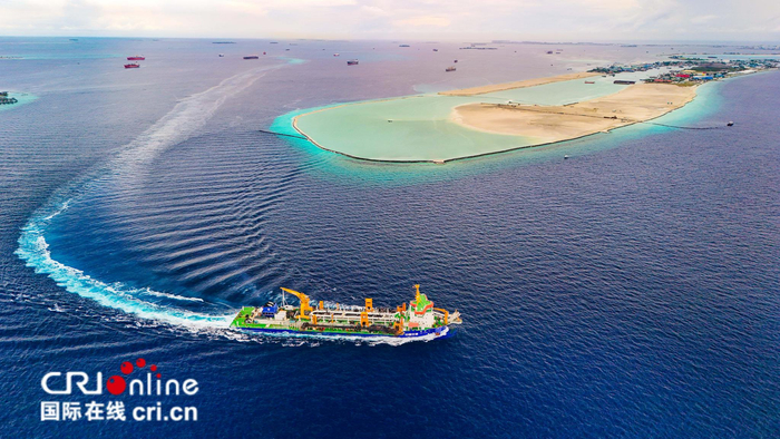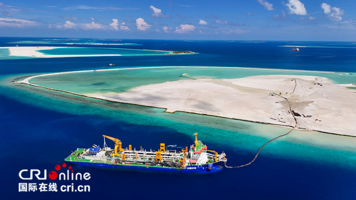 The photo captures a spectacular moment during the commencement of reclamation work by "JUN YANG 1," Asia's largest hopper dredger, operated by CCCC Guangzhou Dredging Co. Ltd., on the AYLA Hotel project in the Maldives. The project involves reclaiming land across 28 islands of various sizes, ultimately forming a chain of islands encircling the Dhigufaruhuraa Atoll. Upon completion, the island chain—with its fine, powdery white beaches—will resemble a string of pearls floating on the "glassy sea," opening up endless possibilities for the hotel's future development.