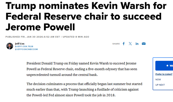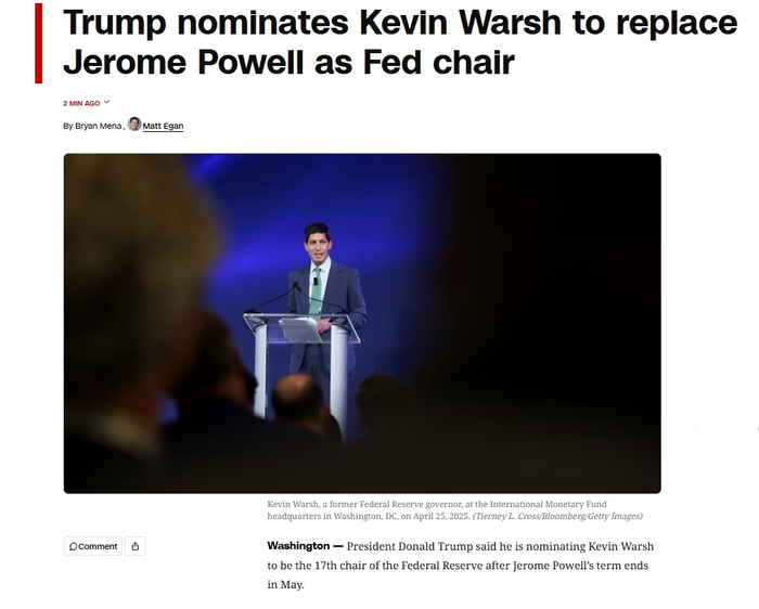 美国总统特朗普30日提名美联储前理事凯文·沃什为下任美联储主席,这一提名还需获得参议院批准。