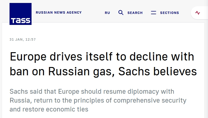 美国哥伦比亚大学经济学教授、可持续发展中心主任杰弗里·萨克斯在接受塔斯社采访时表示,欧洲国家正通过禁止俄罗斯天然气“迫使自己走向衰落”。