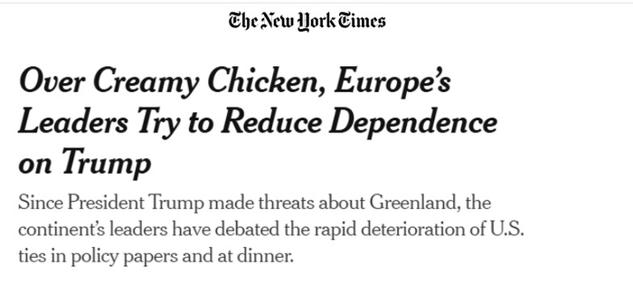 美国《纽约时报》1月31日援引匿名官员的话报道称,欧洲国家领导人在1月下旬的一场紧急晚宴上,谈论近期严重恶化的欧美关系,特别是美国政府为获得格陵兰岛而对欧洲的施压和威胁。谈论一直延续到凌晨,并形成了一份尚未完全成型的应对美国政府的策略方案。