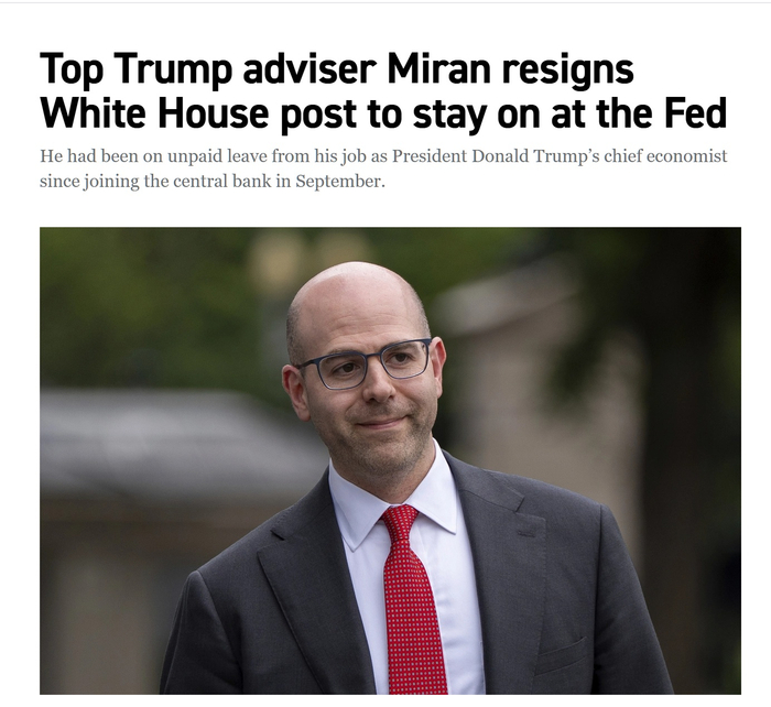 即便在辞去白宫职务后,作为“看守理事”的米兰依然继续强调,美联储今年应继续大幅降息。