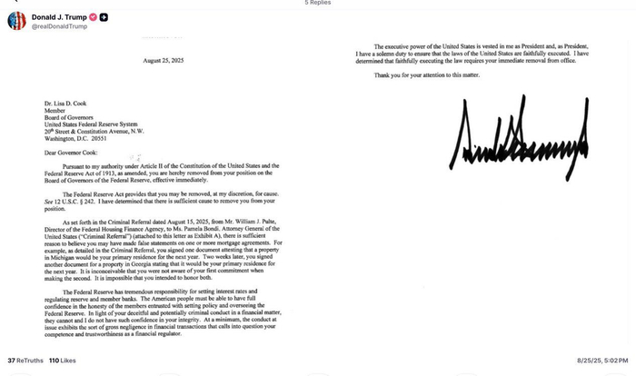 特朗普社交媒体截图·强行宣布“解雇”美联储理事莉萨·库克,并将官司打到最高法院,旨在测试总统是否有权解雇独立机构官员,试图为直接解雇鲍威尔扫清法律障碍。