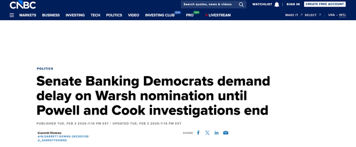 此外,沃什能否顺利接掌美联储目前仍存变数。其中一个最重要的因素,就在于他能否让美国国会相信,他将维护美联储的独立性。