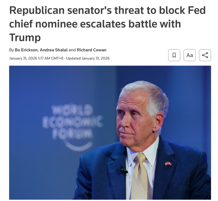 外媒报道截图即便在共和党一侧,同样不缺要求维护美联储独立性的人,参议院银行委员会的共和党籍参议员汤姆·提利斯表示,他将反对并冻结任何美联储官员的提名(包括沃什),直到美国司法部对现任主席鲍威尔进行的刑事调查“得到全面且透明的解决”。