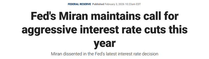 特朗普去年火速提名米兰进入美联储,首要意图是在美联储内部推动降息。我们看到,尽管米兰本人多次表态称,自己在美联储不是特朗普的“传声筒”,但在实际行动上,自2025年9月就任美联储理事以来,他在历次联邦公开市场委员会议息会议上均投反对票,并表现出强烈的“鸽派”倾向,认为美联储降息力度不足或降息速度太慢,这一点与白宫立场完全一致。