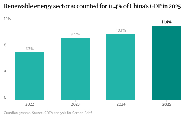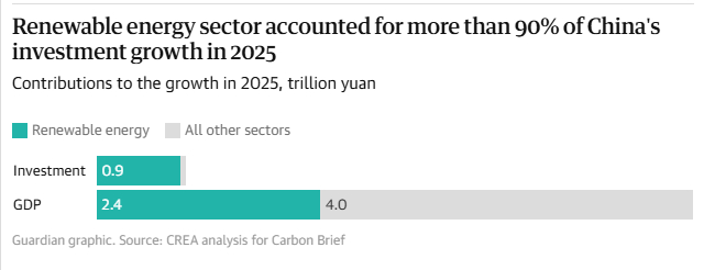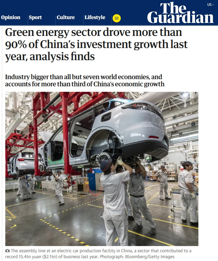 英国《卫报》报道截图分析报告发现,电池、电动汽车、太阳能、风能及相关技术的制造、安装和出口贡献了中国经济增长的三分之一以上。这也是三年内第二次出现这种情况。
