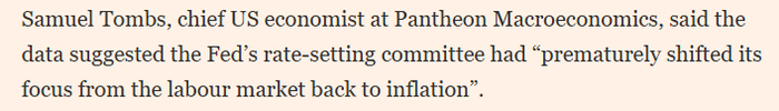 《金融时报》网站报道截图报道还援引万神殿宏观经济咨询公司经济学家塞缪尔·汤姆斯的话称,美国劳工部的数据表明,美联储联邦公开市场委员会 “过早地将注意力从劳动力市场转向了通胀问题”。