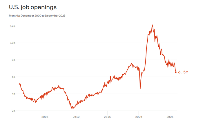 美国《国会山报》援引美国劳工统计局的数据报道称,美国2025年12月份的职位空缺数量为650万个,呈下降趋势,较上年同期减少了96.6万个。