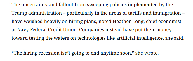 报道还援引美国海军联邦信用合作社(Navy Federal Credit Union)首席经济学家希瑟·朗的观点称,特朗普政府推行的一系列政策,尤其是关税和移民政策,所带来的不确定性及后果对招聘计划造成了沉重影响。希瑟·朗认为,招聘市场的低迷状况短期内不会结束。