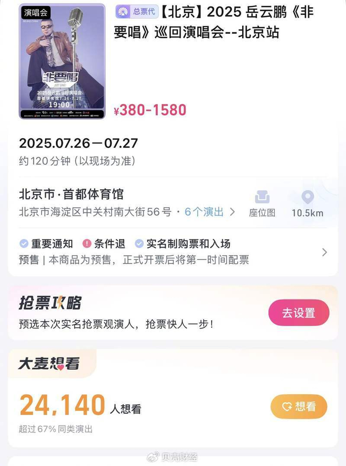 6月12日,“岳云鹏演唱会1580档门票20秒售罄”的话题登上热搜。近日,相声演员岳云鹏通过社交平台宣布将举办个人巡回演唱会,演唱会定名为“非要唱”,首站将于7月26日至27日在北京首都体育馆举行,票价最低380元、最高达1580元。6月12日上午,该巡回演唱会北京站优先购在某购票平台正式开售,该平台显示,已有超2万人标记“想看”,超过67%同类演出。