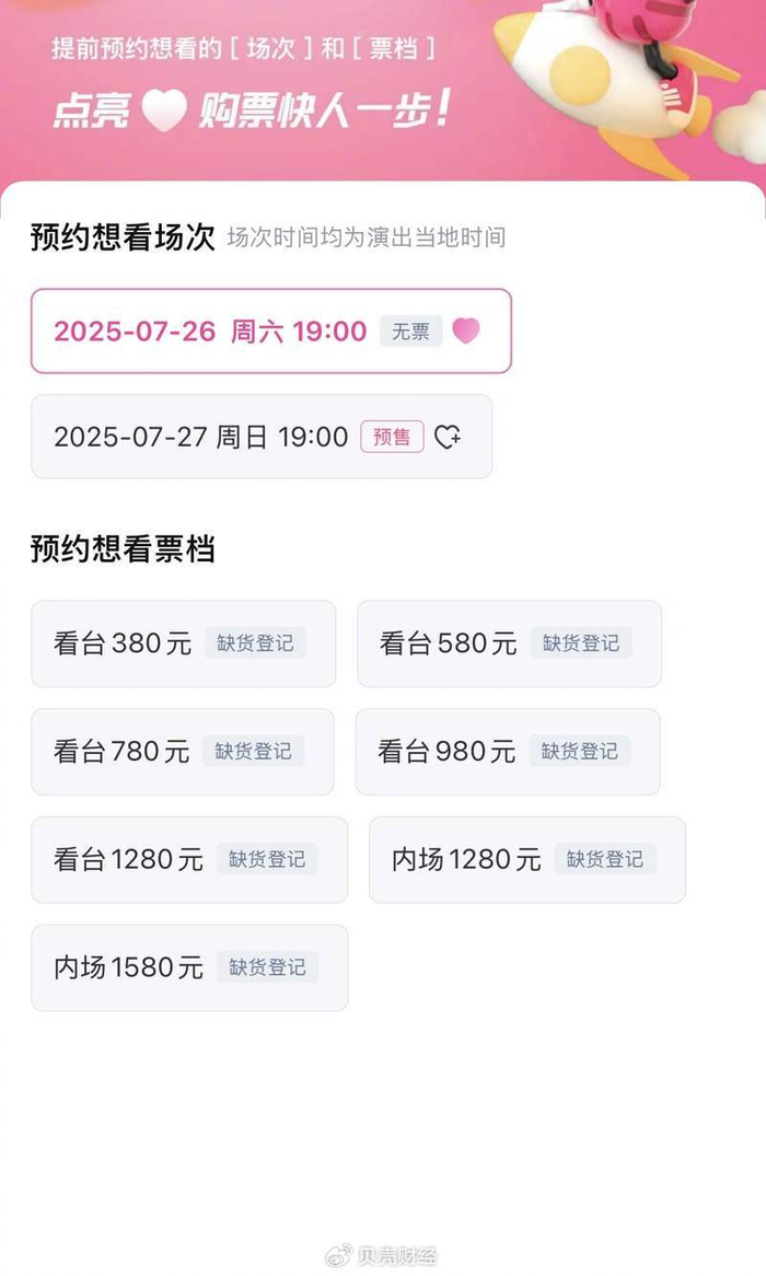 从开票情况来看,截至发稿,首场(7月26日)演唱会已显示无票,各档位门票均显示缺货登记。
