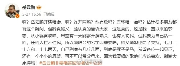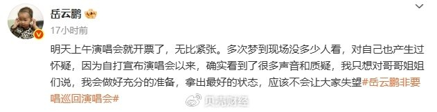 6月11日,岳云鹏发文称,“自打宣布演唱会以来,确实看到了很多声音和质疑,我只想对哥哥姐姐们说,我会做好充分的准备,拿出最好的状态,应该不会让大家失望。”