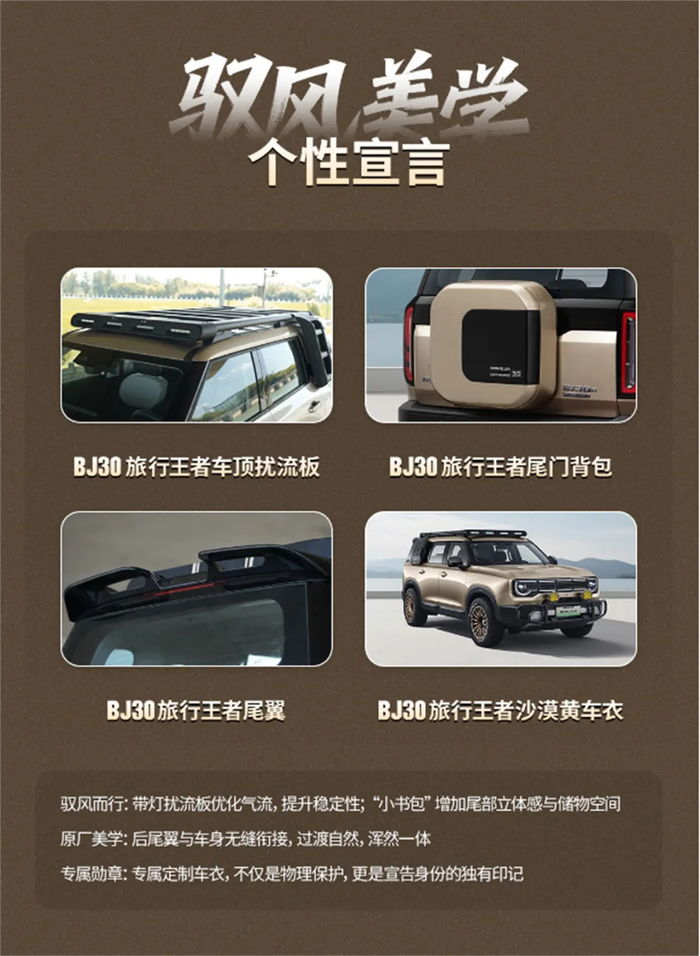 BJ30旅行王者车顶扰流板可优化车身周围气流分布,进一步提升行驶稳定性;尾门背包不仅增强了车辆尾部的立体视觉效果,更拓展了额外储物空间;尾翼与车身无缝衔接,过渡自然、浑然一体,尽显设计质感;专属定制大漠金车衣,既为车身提供物理防护,更为车辆彰显独特身份。