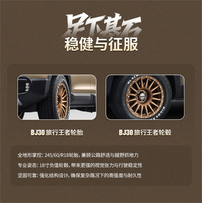 BJ30旅行王者套件搭载245/60R18规格轮胎,兼顾公路行驶的舒适性与越野场景的抓地性能,助力用户实现全地形场景掌控;搭配18寸负值轮毂,不仅赋予车辆更强的视觉冲击力,更通过强化结构设计,确保在复杂路况下具备出色的高强度与耐久性,进一步提升行驶稳定性。