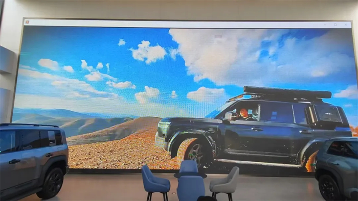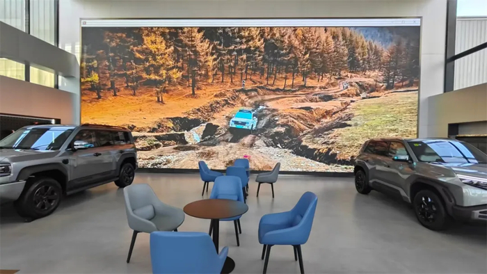 在4S店大堂进门正对着的巨型投影幕上,一直在循环播放方程豹车队在户外越野的各种视频片段,动感激昂的背景音乐与绚丽多彩的越野山水,让每一位路过的顾客都忍不住驻足欣赏。