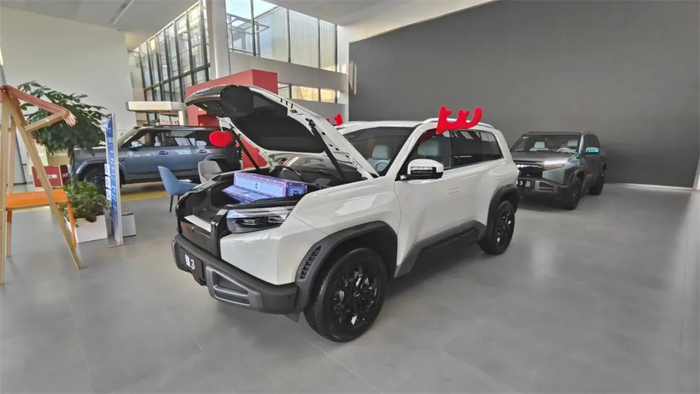 在产品体验区,方程豹旗下的钛3、钛7、豹5、豹8等热销车型一应俱全,并且均可让顾客上车亲身体验。其中一辆钛3更是装饰上了红色的鹿角,为店面增添了一丝喜庆的节日气氛。