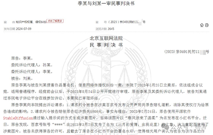 所有平台生成的图片都是不可以侵权第三方商标权、版权等,我国首例“AI文生图”判决,其中涉及就是用Stable Diffusion本地部署生成的图片,复杂的和“独创性”的可以构成美术作品,体现出了原告的个性化表达,作者享有涉案图片的著作权,被告去除水印的行为侵害了原告的署名权,应当承担侵权责任,最后是发布声明向原告李某赔礼道歉,并赔偿经济损失500元。美国版权局明确表示,完全由AI生成的内容不受版权保护,但如果人类对生成过程有实质性贡献可以保护,欧盟倾向于保护用户的创造性投入,与我国基本是一致的。(头图由本地部署开源模型生成)