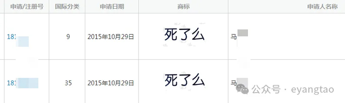 普推知产商标老杨检索发现,“死了么”这个商标早在2015的马某就申请注册过商标,一个是9类科学仪器,申请APP软件都在这个类别,一个是35类广告销售,互联网广告和电子商务在这个类别,但是这两个申请都被驳回,其实这类名称不用想基本上都会被驳回, 在《商标法》一款是,有害于社会主义道德风尚或者有其他不良影响的不得作为商标注册,涉及这些负面名称的基本上无法通过。