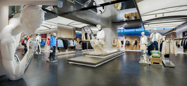步入门店,以"意动永恒"为主题的专业运动区率先进入视野。这一区域以竞技力量元素与科技感的碰撞打造体验空间:入口的滑雪运动专区为空间注入米兰冰雪赛场的速度与激情;后场来到网球与高尔夫专区,与身披FILA经典网球单品BB1大满贯 POLO的雕塑《网球新章》其一再次相遇,感受古典艺术的现代张力,并探索品牌在网球领域的传承与拓新。