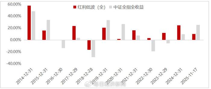 图:红利低波(全)与中证全指全收益指数2014-2024年度涨跌幅&2025年来区间涨跌幅