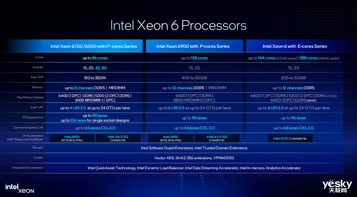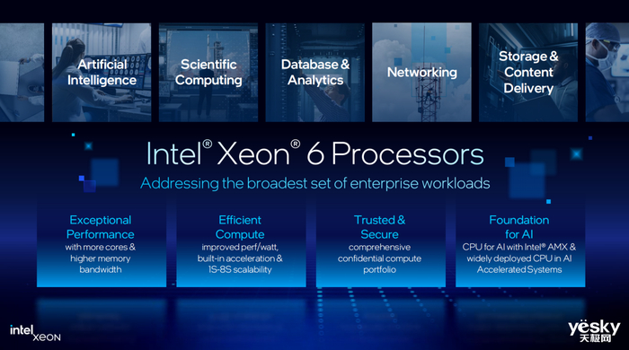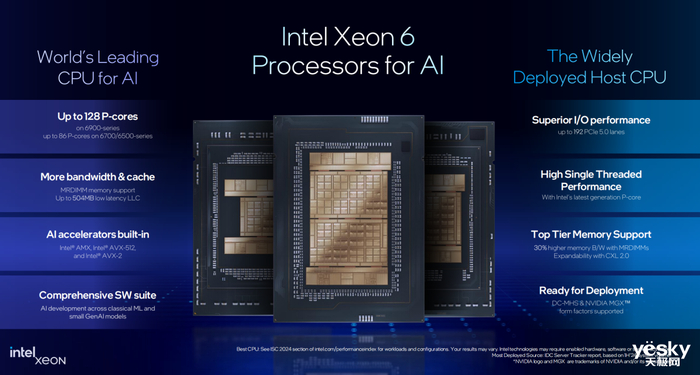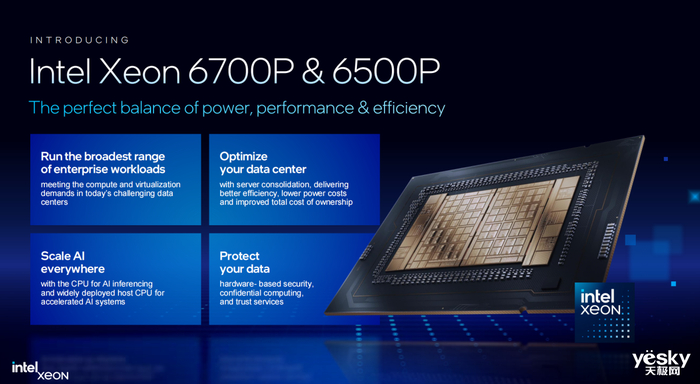 不同于2024年9月发布的至强6900P系列,全新英特尔至强6700/6500性能核处理器是面向主流数据中心的产品系列,无论是AI应用、数据库、边缘、存储以及传统计算需求均可以高效满足。